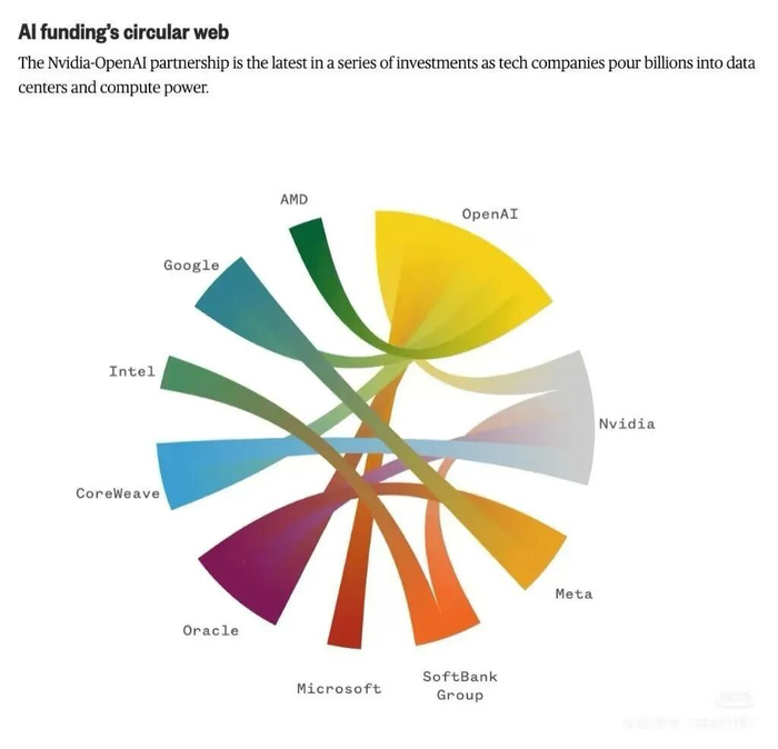 有人说OpenAI是个庞氏骗局,但要看数字。OpenAI没上市,它一个人不可能从股市里套钱,是英伟达、甲骨文、AMD、甚至OpenAI的直接对手Google,这些跟OpenAI做各种交易的企业帮它从股市里套钱。